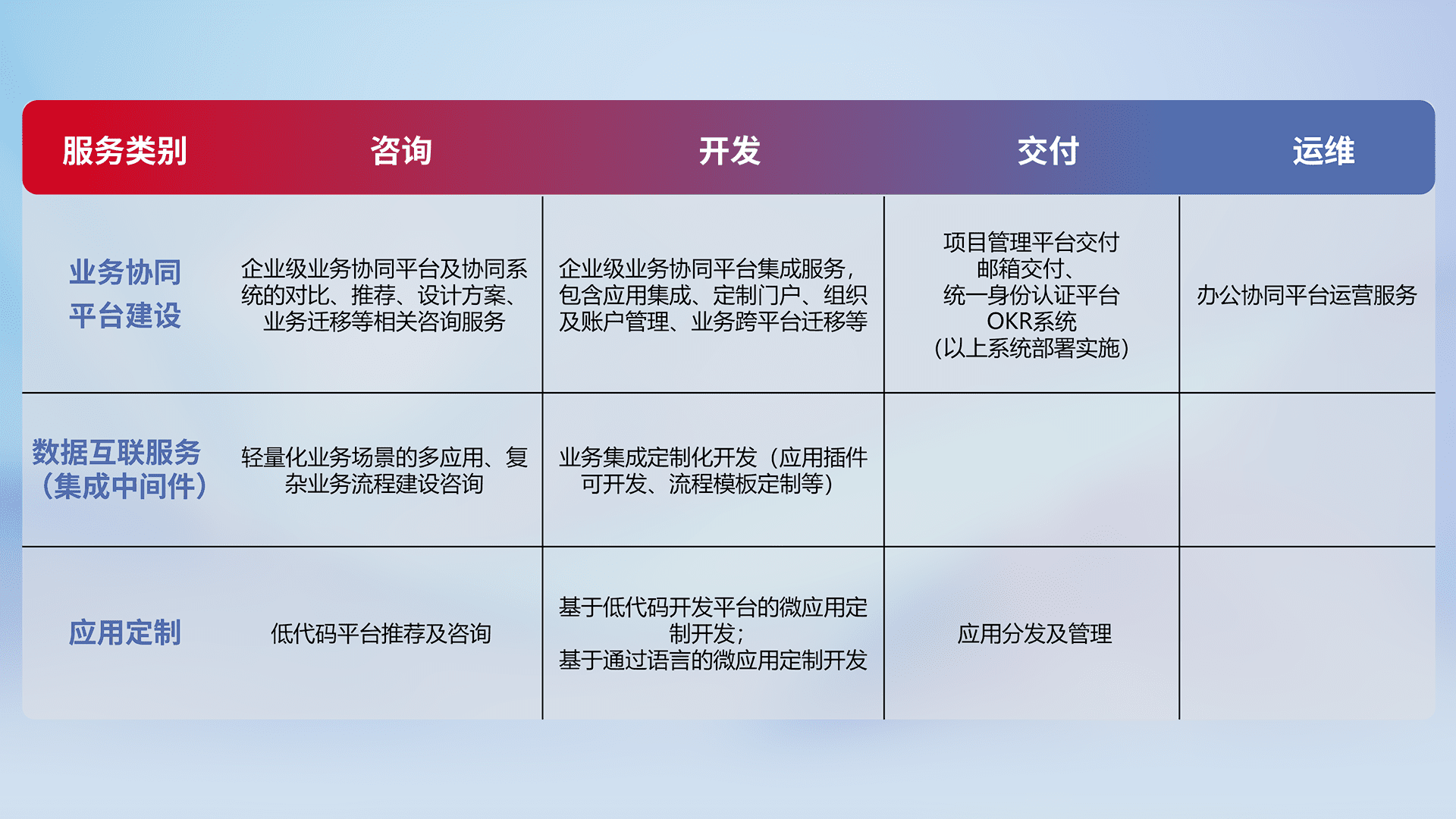 针对钉钉、、、、企微、、IDaas等平台级产品提供产品的规划、、、、方案、、交付、、、、定制化开发等服务,,实现如统一协同办公、、、智能客户服务、、、混合会议管理、、、智能数据查询、、、等业务场景,,,,实现数字化转型。。。。